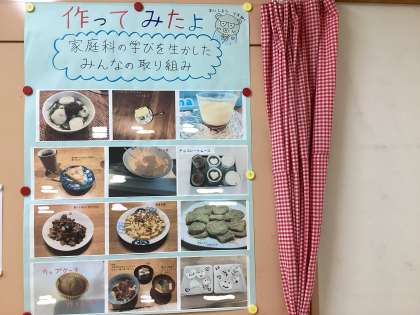 家庭科で学んだことを実生活で生かしている様子は、子どもたちからロイロノートで家庭科専科のところに届けられます。家庭科室前に掲示されています。