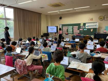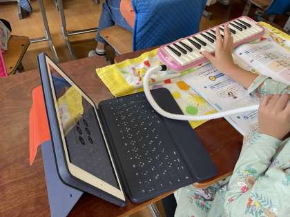 教科書にあるQRコードを読み込んで、ドレミファソの中から音を選び、「タン、タン、タン、ウン」のリズムで旋律をいろいろと作りました。つくった旋律は再生して聴きました。一番のお気に入りを提出してから、友達のつくった旋律を見たり、自分がつくったお気に入りの旋律を鍵盤ハーモニカで練習したりしました。