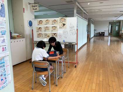 6年生の外国語では、My summer vacation をテーマに、今までの学習で学んだことをもとに文章を作り、発表の練習を積みました。外国語専科教員が一人ずつ知識や技能を確認していきました。子どもたちは、タブレットにまとめたものを見せながら発表していきました。