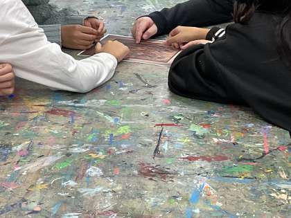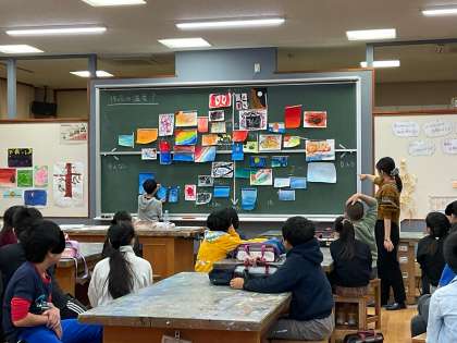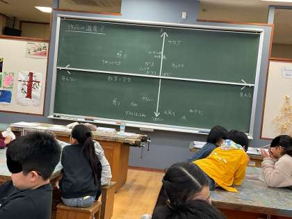 4年生は来週、世田谷美術館に美術鑑賞教室で出かけます。その前に美術館の方にご来校いただき、事前学習を行いました。今日は、「目に見えないものを絵で表現することを楽しもう」をめあてに、「作品の温度」について縦軸に「あついもの」「つめたいもの」横軸に「見えない」「見える」といった座標軸を活用しながらみんなで考えました。その上で、用意していただいた絵から感じることを発表し合い、自分でも温度のある作品をつくりました。