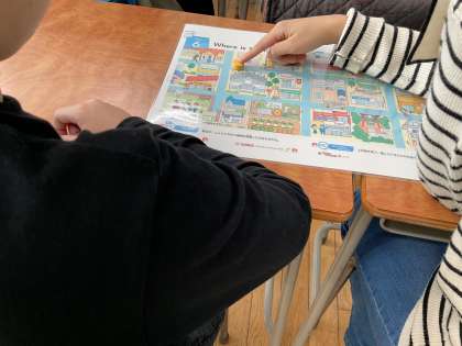 5年生の外国語です。今日は、場所への行き方の伝え方などを学び、地図を見ながら2人組で練習をしました。何度も繰り返すうちに慣れ、習得していきました。