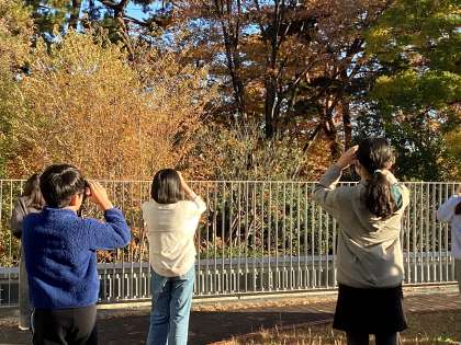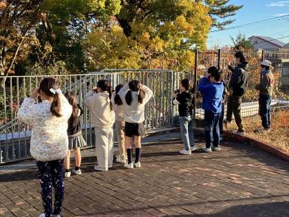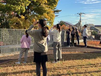 例年にない暖かい師走。今朝は、爽やかな青空のもとたくさんの鳥が見られました。50人の子ども達が参加し、「見つけたよ!」と歓声。「あの鳥は、何?」「あっちは、ヒヨドリ。こっちは、セキレイだよ。」と教え合っていました。