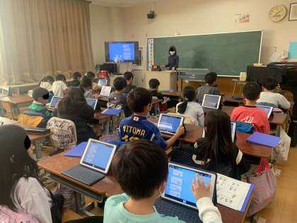 3年生の音楽です。「よろこびのうた」を聴き、ホルン、トランペット、トロンボーン、チューバといった、いろいろな楽器の音の響きを確かめました。
