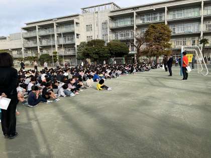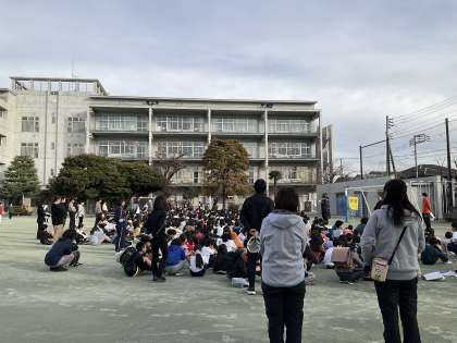 水曜日の朝、予告なしの避難訓練が行われました。午前8時20分に地震発生、その後主事室から出火の想定で行いました。登校後にすぐの訓練でした。教室以外にも、廊下や階段、校庭にいた子どもたちもいました。そうした状況にあっても、自分の命を自分で守る態度で、全校児童が静かに整然と避難できました。