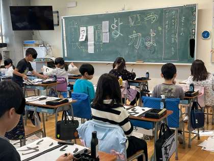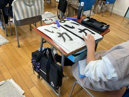 3年生の書写では、書き初めで取り組む「つよい力」の練習をしました。毛筆の学習は3年生から始まりましたが、「横画」「縦画」「はらい」「おれ」「はね」「曲がり」など、筆使いがずいぶんと上達しました。今日は、文字の大きさと位置にも気をつけて書きました。