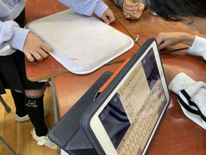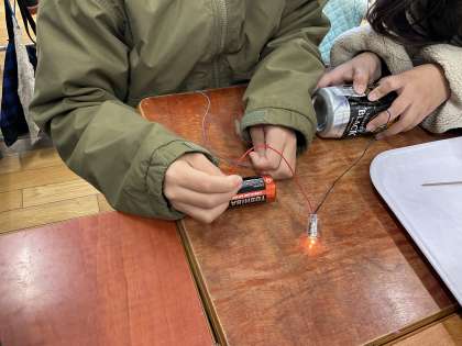 3年生の理科です。アルミ缶やスチール缶、銅のくぎ、鉛筆、ビーカー、割り箸などを回路の途中に置いて、電気を通すものと通さないものを調べました。どんなものが電気を通すか予想を立てながら調べました。