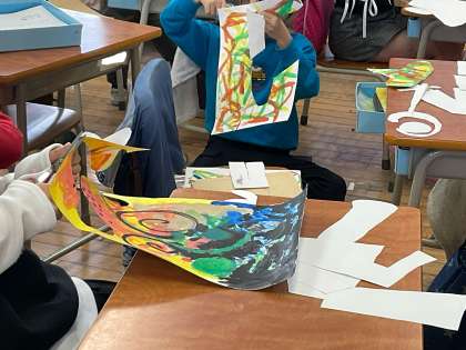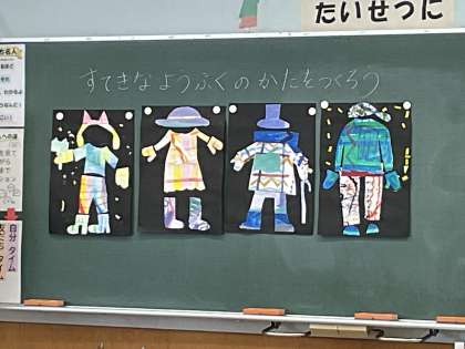 2年生の図工科です。白画用紙に絵の具で色々な模様を描きました。これを利用して洋服のデザインを考えて、型紙を作りました。黒画用紙に貼り付けてすてきな作品が出来上がりました。3学期の展覧会をお楽しみに。
