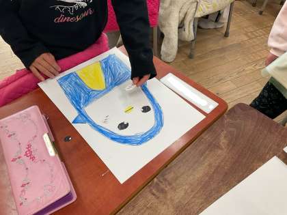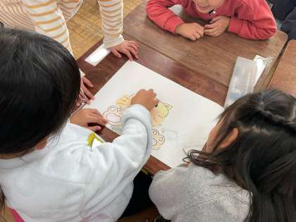1年生は、道徳の時間に日本に伝統的に伝わる遊びについて、教科書の絵を手掛かりにしたり、自分の体験をもとにしたりして話し合いました。実際にオリジナルの「福笑い」を作って、グループのみんなで楽しみました。ニコニコ笑顔と笑い声が響きました。
