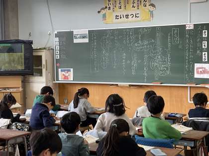 2年生の国語。モンゴルの草原に住むスーホという少年と白い馬の長いお話です。登場人物の様子が分かる言葉に気を付けて読みながら、心を動かされたこととその理由を伝え合っていきます。友達と自分の感じたことの似ているところ、違うところも交流していきます。