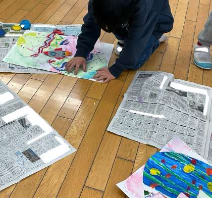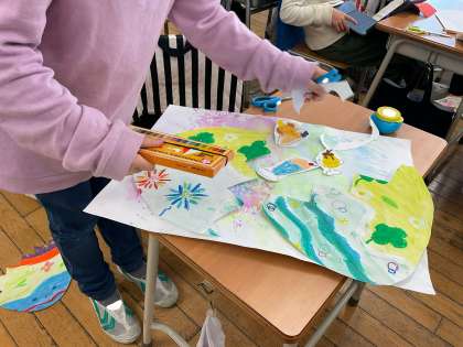2年生の図工です。カラフルなたまごを描きました。そのたまごを割ると中から飛び出してきたものは・・・。飛び出てくるものとして、自分が好きなものを描いて切り抜き、たまごから飛び出る様子を考えながらが、画用紙に配置していきました。