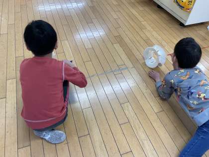 1年生の生活科の学習で「風と遊ぼう」に取り組み、かざぐるまやかざわを作りました。よりよく回って動くように、羽の枚数や傾きを工夫し、風の送り方も考えました。