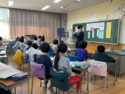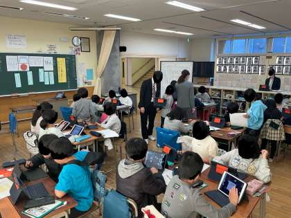 4年生の研究授業です。みんなの生活に関する疑問をグループで調査し、クラスのみんなに発表していきます。本時では、アンケートを集計して結果を整理・分析して、発表の組み立てを考えていきました。