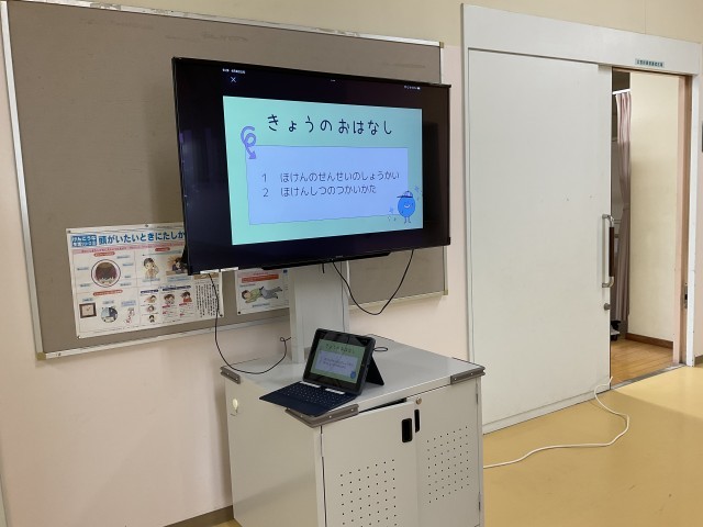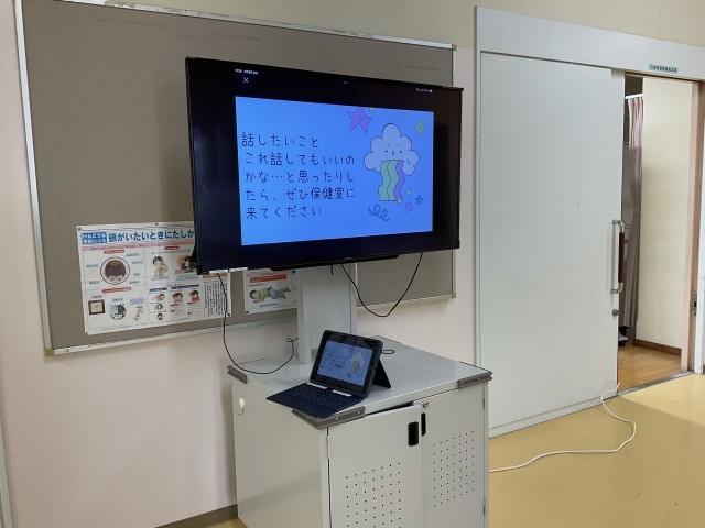 身体測定が始まりました。多目的室で視力、保健室で身長・体重の測定を行いました。保健室前で計測の順番を待ちながら、養護教諭が作成した「今日のお話」を見て保健室の役割や使い方も知りました。