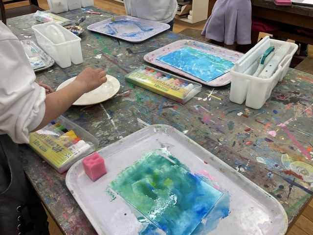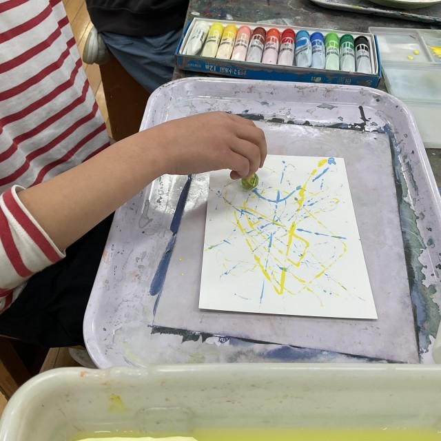 4年生の図工です。やったことのあるワザや新しいワザを試したり組み合わせたりして、絵の具ワザコレクションをつくっていきました。3年生までに図工で学んできたワザには、「ぼかす、水の量の工夫、筆の使い方、色を重ねる、混ぜる、スポンジやビー玉を使う」などがあります。今後、できた研究の成果を紹介するためにコレクションブックにしていきます。