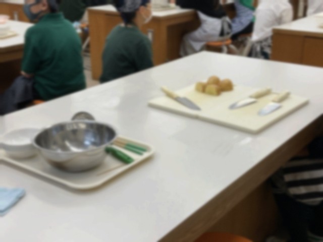 お茶の入れ方に続いての調理実習です。今日は粉吹きいもを調理する中で、包丁やピーラーの使い方、茹でる調理について学びました。