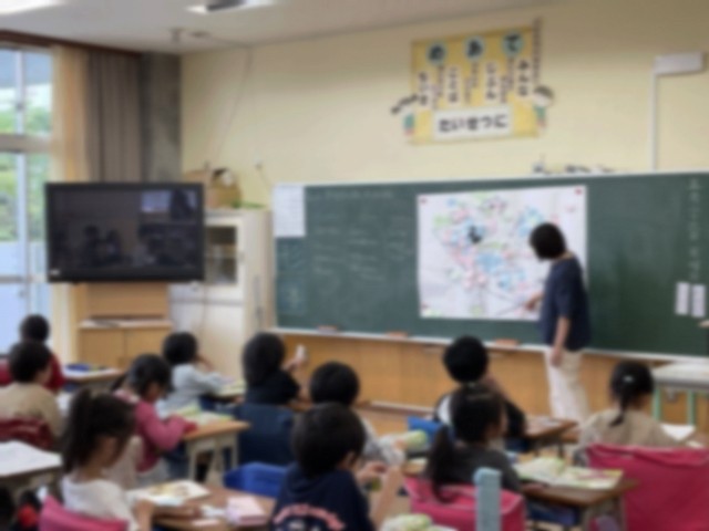 校区地図を見て、知っている施設、公園、商店などを付箋に書いていきました。書いた付箋を黒板の校区地図ににはり、知っていることを共有していきました。でももっといろいろな場所がありそうです。地域のことをもっと知りたい、調べたいという意欲をもった子どもたちです。まずは金曜日にみんなで学校の周りを歩いてみることになりました。分かったことをもとにしながら計画し、これから何回か町探検に出かけます。