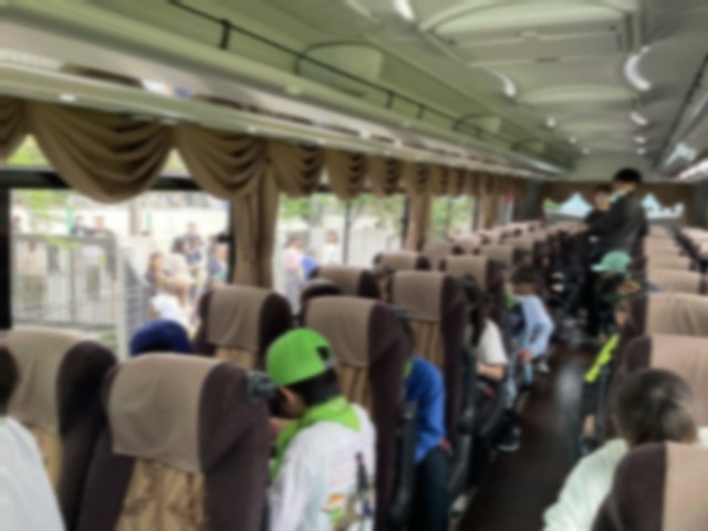 バスに乗りました。シートベルトをして準備OK。保護者の方や先生たちが見送ってくださいました。途中2回トイレ休憩をします。元気に行って来ます。