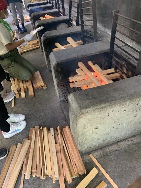 かまどに薪を組んで火を起こしました。なかなか火がつかないかなと心配していましたが、補助員さんの話をよく聞いて取り組んだので、あったいう間にうまく火がつきました。