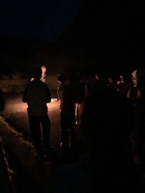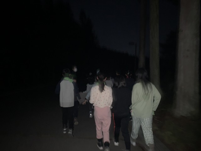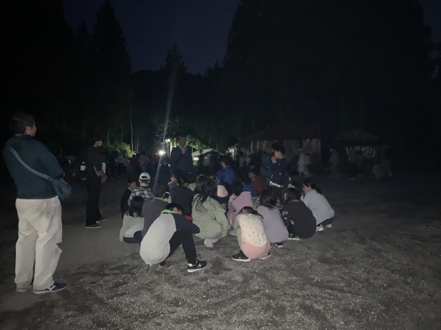 ナイトハイクを行いました。暗闇の中で目を凝らしたり、耳をすませたり、匂いを感じたり、肌で感じたり、感覚を研ぎ澄まして歩きました。各学級に1人のガイドさんについていただき、いろいろなことを教えていただきました。