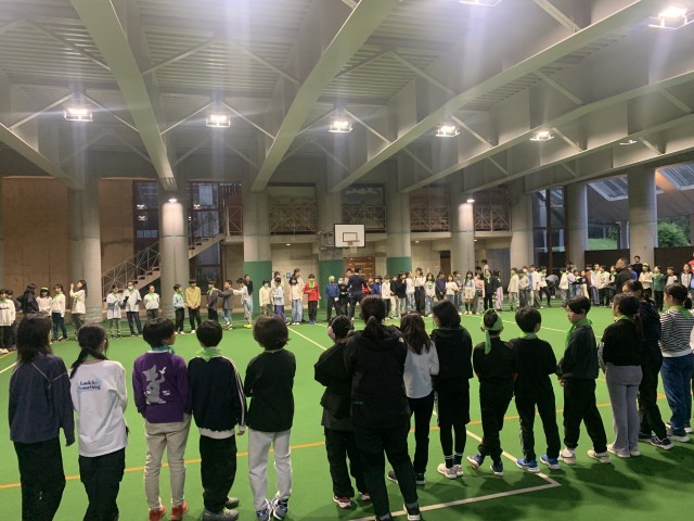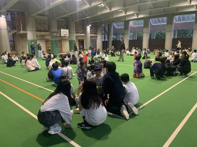 雨降りです。残念ながら、外でのキャンプファイヤーはできません。キャンプファイヤー係を中心に屋根付き広場で行うことにしました。それでも子どもたちは大盛り上がり。オープニングの歌を歌って、最初のゲームは、「猛獣狩りに行こうよ」。お馴染みのゲームですが、思いっきり楽しんでいます。