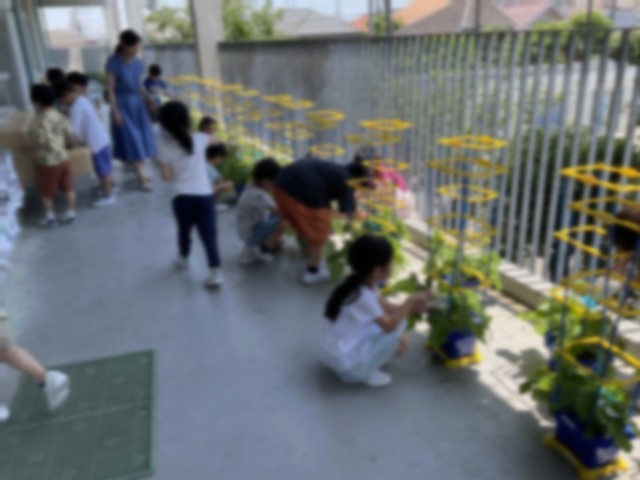1年生は、アサガオを一人ずつ育てています。毎日の水やりは欠かしません。日に日に育っているアサガオの変化を「見て、見て」と話してくれる1年生です。