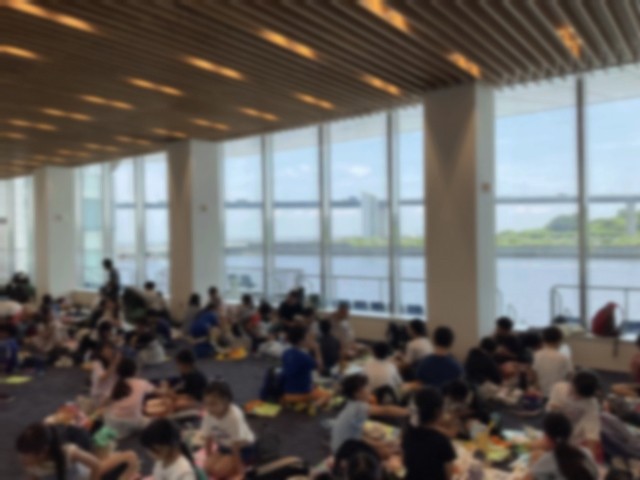 海の森水上競技場の集会室をお借りして、お弁当を食べています。目の前に競技場が広がり、景色も楽しんでいます。