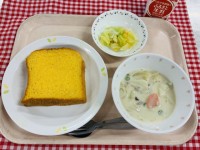 ★今日の給食★オレンジフレンチトーストキャベツとコーンのサラダペンネシチュー