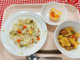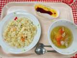 ★今日の給食★ パエリア 牛乳 スパニッシュオムレツ 野菜スープ ★今日の給...