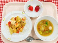 ★今日の給食★家常豆腐丼牛乳うずら卵と野菜のスープいちご