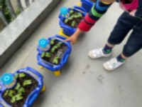 2年生に教えてもらいながら蒔いたアサガオの芽が出て、双葉にまで育ってきました(蒔...