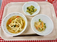 ★今日の給食★みそ煮込みうどん大根とじゃこのサラダ青のりフライドポテト