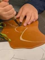 日光彫り体験をしました。使う道具は、「日光ひっかき刀」です。図工の版画で使った彫...