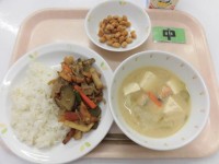 『今日の給食』 麦ごはん きんぴら煮 三平汁 きなこ豆 牛乳