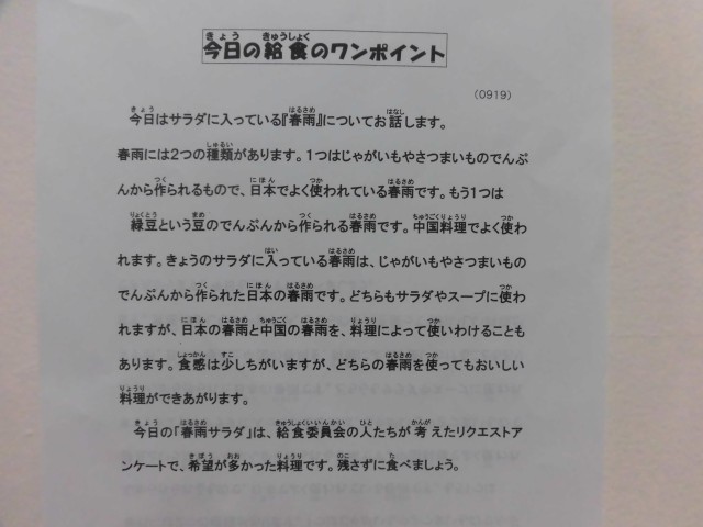 *「春雨サラダ」は、給食委員会の子どもたちが考えた、リクエストアンケートで希望が多かった料理です。