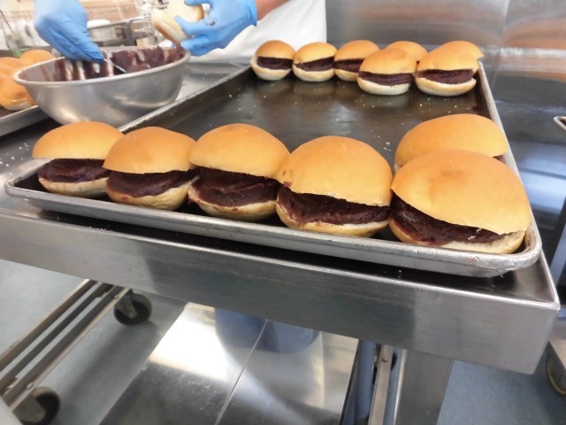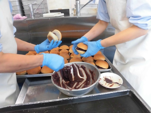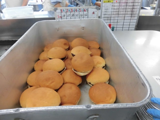 小豆を煮る⇒ミキサーにかける⇒釜に移してに始める⇒砂糖を加えてさらに煮る⇒煮詰まってくると、あんこがはねるので、火傷に注意しながらさらに煮詰める⇒あんこが出来たら全体の重さを量り、一人分の量を計算する⇒パンに切り込みを入れ、ここにあんこを挟む⇒クラスごとの食缶に並べ入れる