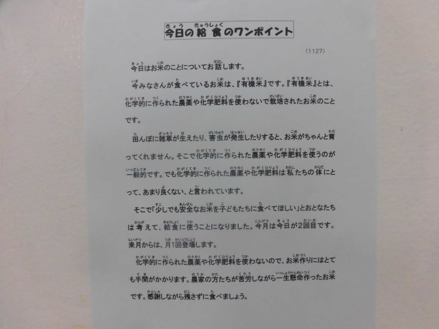 *今日のごはんは有機米を使用しました。秋田県産 あきたこまちです。