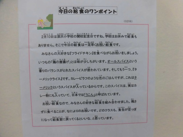 *2月10日(火)は、深沢小学校の開校記念日です。今日の給食は一足はやく、お祝い給食です。