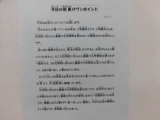 *今日のごはんは有機米です。銘柄はつや姫で、宮城県産です。