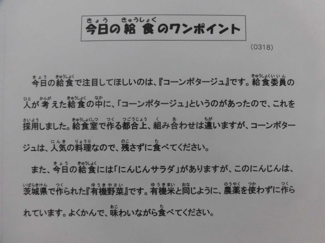 *今日のコーンポタージュは、給食委員の児童が考えた給食です。