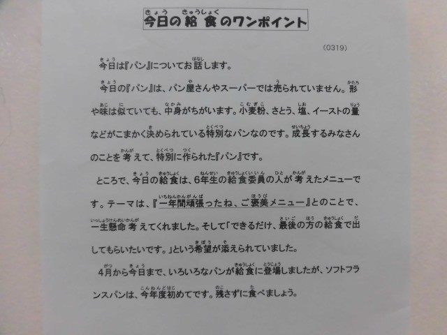 *今日の給食は、6年生の給食委員の児童が考えたメニューです。『一年間頑張ったね、ご褒美メニュー』とのことで、「3月の給食の最後の方で出してほしいです。」というメッセジーが添えられていました。