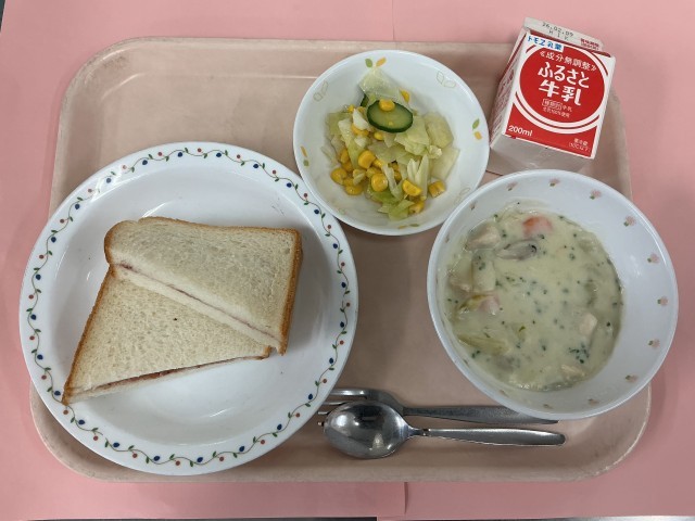 ジャムサンド クリームシチュー コーン入りフレンチサラダ 牛乳