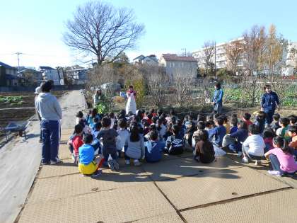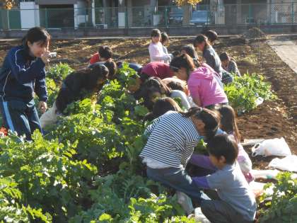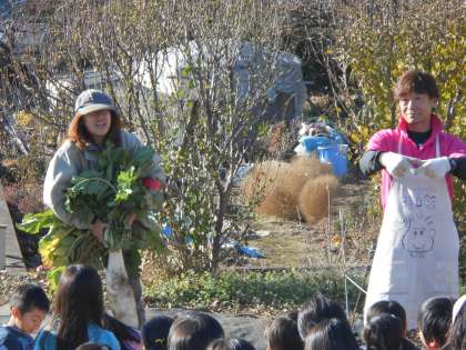 12日に1年生が、だいこんぬきに再チャレンジしました。1本6kgもある「おふくろ」だいこん。2人で1本を力を合わせてぬきました。「うんとこしょ、どっこいしょ。」声を出してぬきました。1本を半分に切って持ち帰りました。また、今日の給食にも登場します。