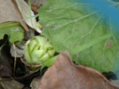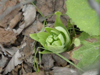 うすい緑色の葉のようなものに幾重にも包まれている様子は、寒さに負けないようにたくさん着込んでいるようにも見えます。目立たないですが、その中には、フキの花が見られます。目立たない花ですが、一生懸命生きている様子が見られます。