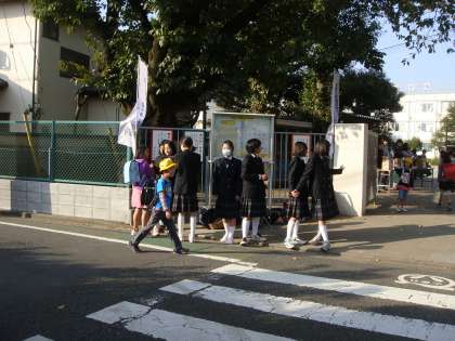 町会の方々、中学生(1年生)が、正門近くに立って、あいさつの声をかけていました。