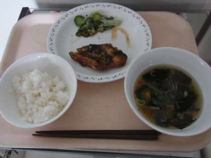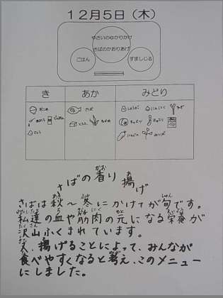 今日の給食は給食委員会の子どもたちが「ご飯をおいしく食べる」ことをテーマに考えた献立です。生姜とにんにくのきいたタレのかかった鯖の香り揚げは、白いご飯にぴったりのおかずでした。