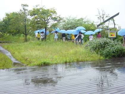屋上緑化として、ビオトープも作られ、雨の中を観察しました。