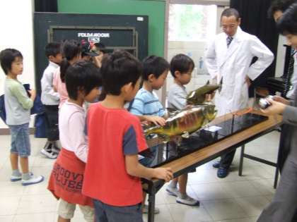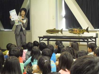 水産総合研究センターの方をゲストティーチャーに迎え、「生き物のふしぎを知ろう」の学習で、魚のクイズや、サケの生態について、わかりやすく楽しくお話ししていただきました。本物のと同じ大きさの模型をだきかかえて、その重さにみんなびっくりしていました。