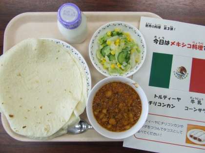お楽しみ給食、世界の国のメニュも今日で4日目。学級閉鎖のクラスが多くて、たくさんの子どもたちが食べられなかったのがとっても残念ですが、調理の皆さんの力と心のこもったメニュを、せめて写真でご紹介します。初日のロシアの料理は撮り忘れてしまいました。(すみません)2日目韓国料理(写真1)。3日目メキシコ料理(写真2)。4日目タイ料理(写真3)です。来週は、スペイン料理とギリシャ料理です。いままで食べられなかった子も、食べられるといいですね。調理の皆さん、本当にありがとうございます。