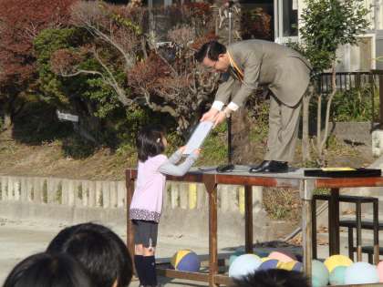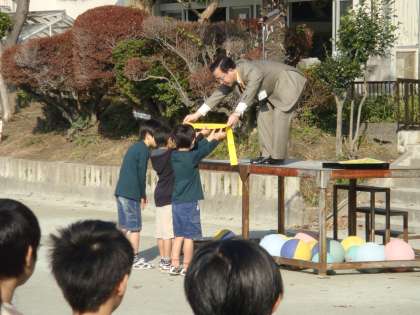 今日の全校朝会は、平尾先生の保健のお話でした。今月の保健目標「みんなと仲良く楽しく過ごそう」について、悪口を言ったり、言われたりした時のことをペープサートを使って話してくださいました。その後、夏休み中に「ガーデニングコンテスト」に応募し入選した児童に記念の盾が、そして、東深沢スポーツ文化クラブ主催の「走る楽しさを知ろう!スポーツデイ」に参加した児童に講師の元オリンピック選手 高岡寿成氏から参加記念として贈られたサイン入りタスキが校長先生から手渡されました。いろいろなところで活躍している児童に拍手です。