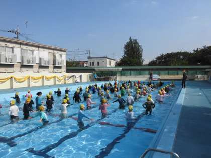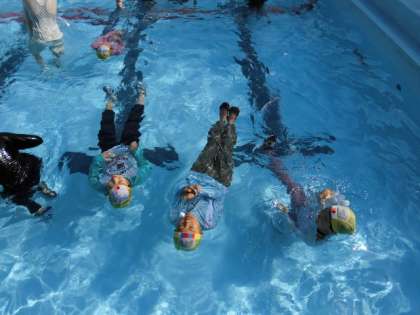 着衣水泳では、長く浮いて、救助をまつためにはどのような浮き方がよいかなどいざというときのための対処方法を学びました。